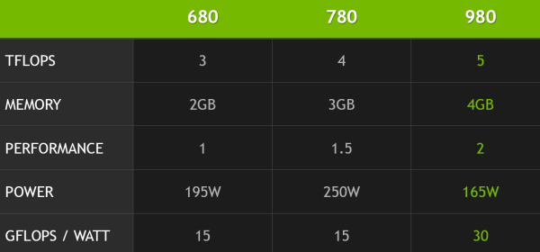 Судя по теоретическим цифрам, Geforce GTX 980 должна опережать и GTX 680 и GTX 780, имея больше видеопамяти, лучшую математическую производительность и филлрейт. При этом новинка потребляет заметно меньше энергии, что приводит к вдвое лучшему показателю энергоэффективности — потрясающий результат!