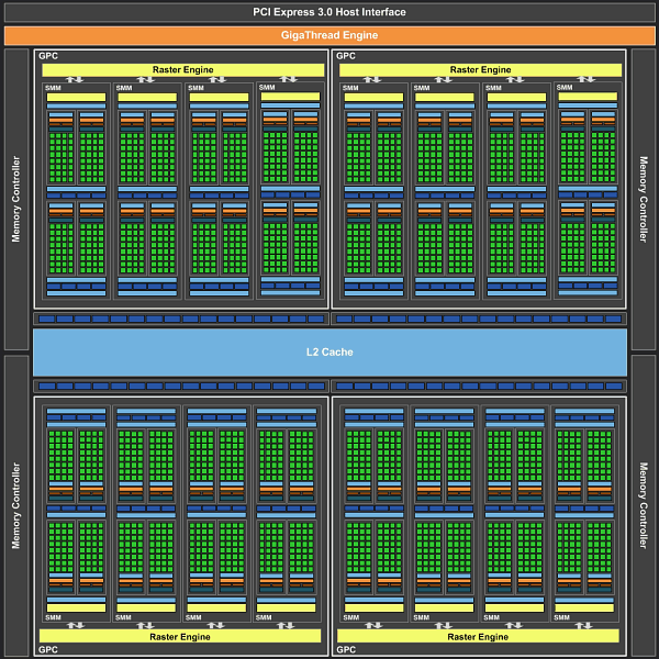 Как Fermi и Kepler, да и архитектурный первенец GM107, новый чип GM204 состоит из кластеров графической обработки Graphics Processing Cluster (GPC), которые содержат по несколько потоковых мультипроцессоров (в данном случае — SMM). Каждый кластер GPC содержит выделенный движок растеризации и по четыре мультипроцессора SMM. В свою очередь, каждый мультипроцессор состоит из 128 вычислительных блоков CUDA, блока обработки геометрии PolyMorph и восьми блоков текстурирования (TMU).