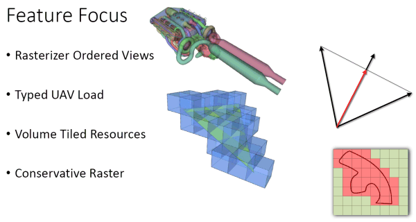 Кроме этого, в новой версии появится как несколько новых возможностей, долгожданных для 3D-разработчиков, так и толком не используемая функциональность предыдущих версий. К примеру, еще в DirectX 11.2 появилась поддержка тайловых ресурсов (tiled resources), которые можно использовать для рендеринга теней при помощи карт теней разного разрешения (multi-resolution) вместо одного фиксированного.