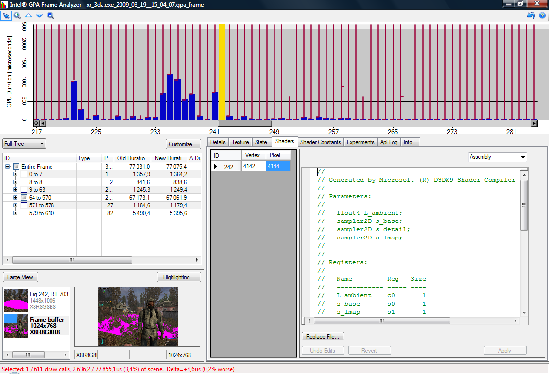 Подводя промежуточный итог, можно сказать, что Frame Analyzer является весьма удобным средством для отладки и оптимизации Direct3D приложений. Разработчики графических приложений, в частности игр, смогут сразу увидеть, какие вызовы draw call требуют больше времени для отрисовки, наглядно видеть используемые текстуры, буферы отрисовки, шейдерный код, и все вызовы Direct3D при построении кадра.