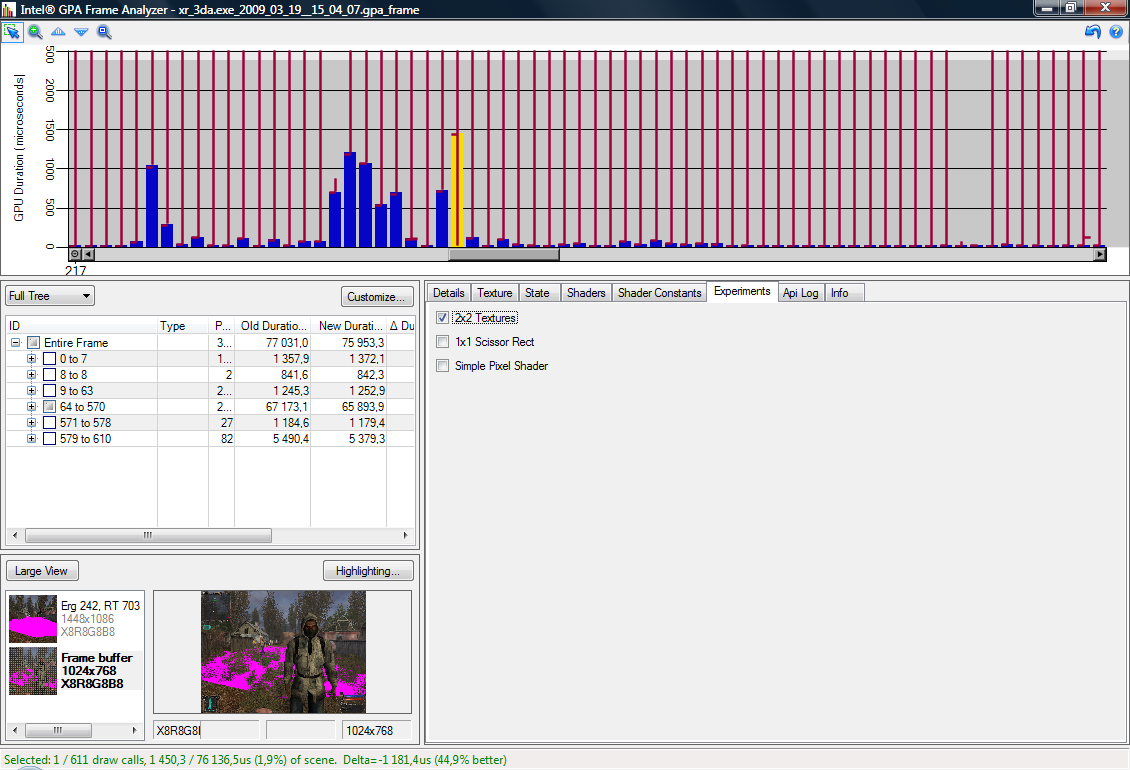 Также очень удобно, что можно запускать определённые эксперименты (обходные режимы), как в System Analyzer, но уже для любых вызовов draw call по желанию. То есть, можно применить любой из доступных обходных режимов (2x2 Textures, 1x1 Scissor Rect, Simple Pixel Shader), или даже все сразу, либо для одного вызова отрисовки, либо для нескольких выделенных, что даёт большую гибкость.