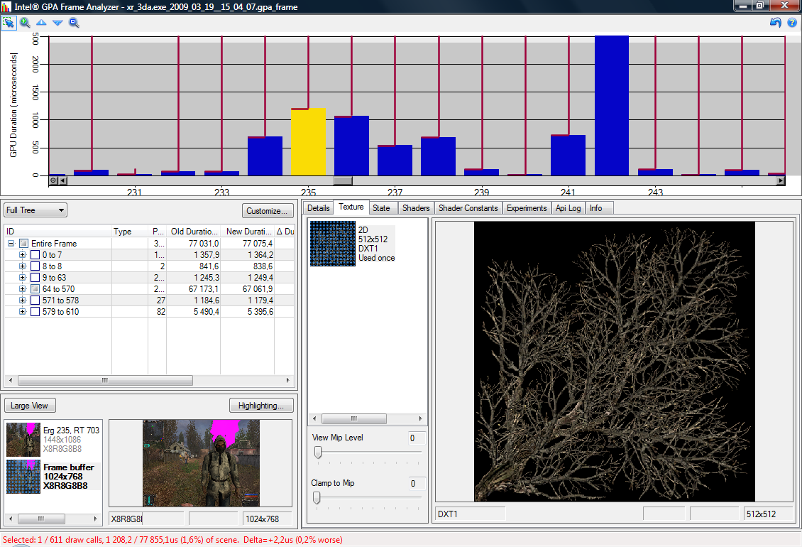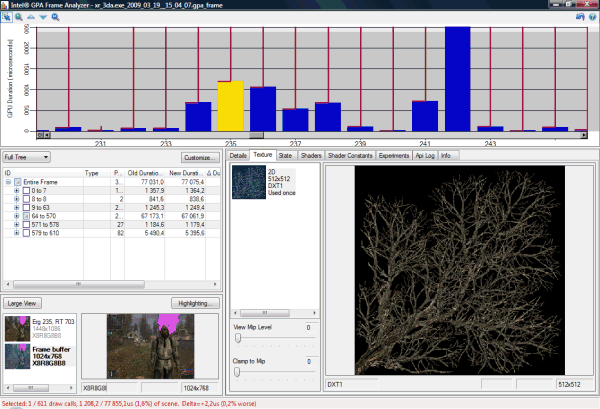При помощи Frame Analyzer можно найти и наиболее требовательные к пропускной способности текстурной памяти вызовы. Для этого нужно выделить требуемые фрагменты построения кадра, и ограничить использование самыми низкими мипуровнями текстуры при помощи ползунка «Clamp to Mip». Сцена перерисуется с меньшей детализацией, и можно будет оценить изменения времени, потраченного на отрисовку. Если это изменение серьёзно увеличивает производительность, значит, полоса пропускания текстурной памяти ограничивает скорость рендеринга, являясь «узким» местом. Также этой возможностью удобно пользоваться при определении оптимального размера текстуры, ведь на отрендеренном кадре можно сразу увидеть все сделанные изменения.