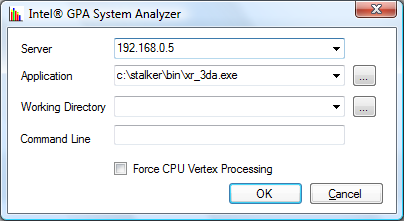 В случае сетевого режима нужно задать некоторые параметры в утилите System Analyzer: IP адрес, путь к исполнимому файлу приложения (на тестовой системе), рабочий каталог (если программой используется несколько исполнимых файлов) и командную строку, если это необходимо. Также есть возможность запуска с форсированной вершинной обработкой на CPU («Force CPU Vertex Processing»). В этом режиме драйвер выполняет всю обработку вершин на CPU, а не GPU.