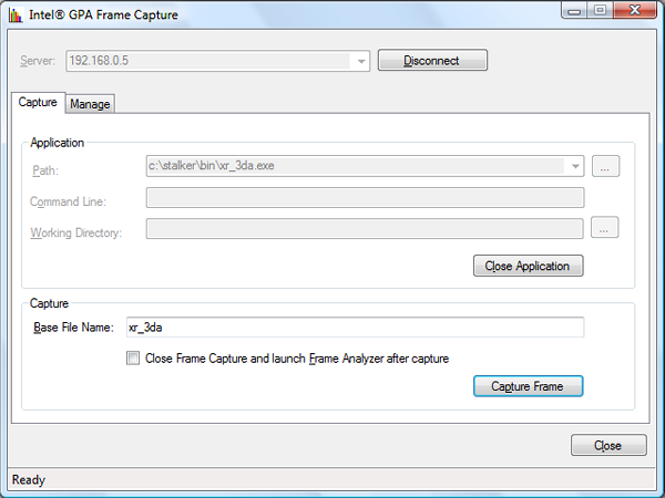 Для захвата кадра или нескольких при помощи GPA Frame Capture, нужно запустить GPA Remote Server на тестовой системе, а GPA Frame Capture на той, которой будет проводиться анализ. Достаточно указать IP адрес целевой машины, соединиться с серверной частью, выбрать приложение, которое будет запущено на тестовой системе.