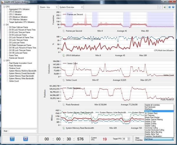 Null Driver режим отключает обработку в драйвере. Если включенный Null Driver увеличивает производительность, а Null Hardware нет, то приложение ограничено работой CPU в драйвере. В случае, если оба режима не ускоряют рендеринг, то само приложение ограничено скоростью центрального процессора.