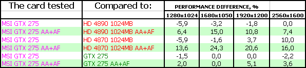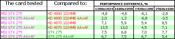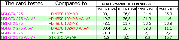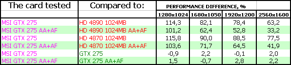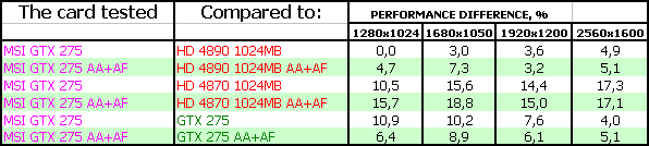 MSI Geforce GTX 275 Lighting 1792MB PCI-E - очень интересный продукт, имеющий незначительно повышенные частоты, которые принесли невысокие дивиденды (от 5 до 8 процентов прироста производительности). Однако это не главное у изделия. Основной момент - прекрасный и высокоэффективный кулер, а также комплектация утилитой Afterburner (наверно в качестве альтернативы предыдущему AirForce), позволяющкй как управлять разными режимами работы карты, так и получать полноценную информацию о текущем состоянии карты.