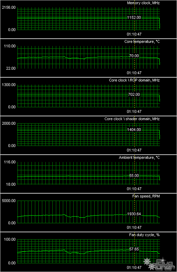 Мы провели исследование температурного режима с помощью утилиты RivaTuner (автор А.Николайчук AKA Unwinder) и получили следующие результаты: