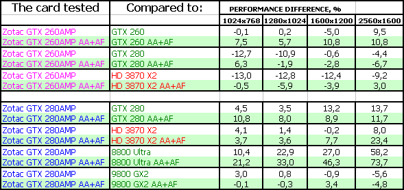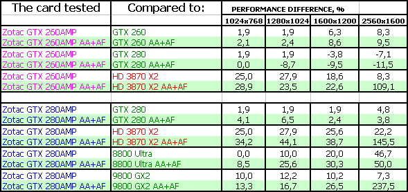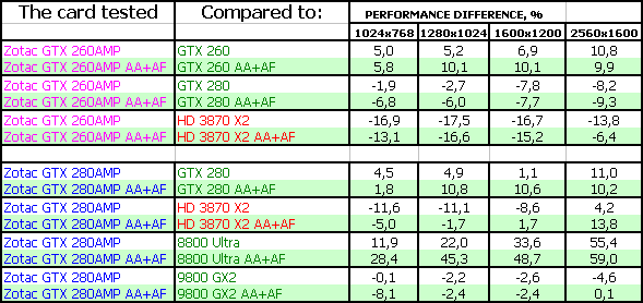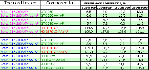Zotac Geforce GTX 260 AMP! 896MB PCI-E — очень интересный продукт при условии, если его цена будет не выше $400, а в условиях падения цен на 9800 серию, и даже ниже. Находится между 9800 GTX и GTX 280, тяготея по скорости к последнему. Разгон получился неплохим по отдаче, поэтому полагаем, что за этими картами — будущая слава самой лучшей покупки в ценовом сегменте выше $300 (подчеркиваем, выше 300!, Поэтому новинка от AMD — RADEON HD 4870 к этой категории НЕ ОТНОСИТСЯ!), тогда как 3870 Х2, хоть и имеет небольшие преимущества по скорости в ряде тестов, заведомо хуже из-за присутствия технологии CF, пока не обеспечивающей приемлемого качества ВО ВСЕХ играх.