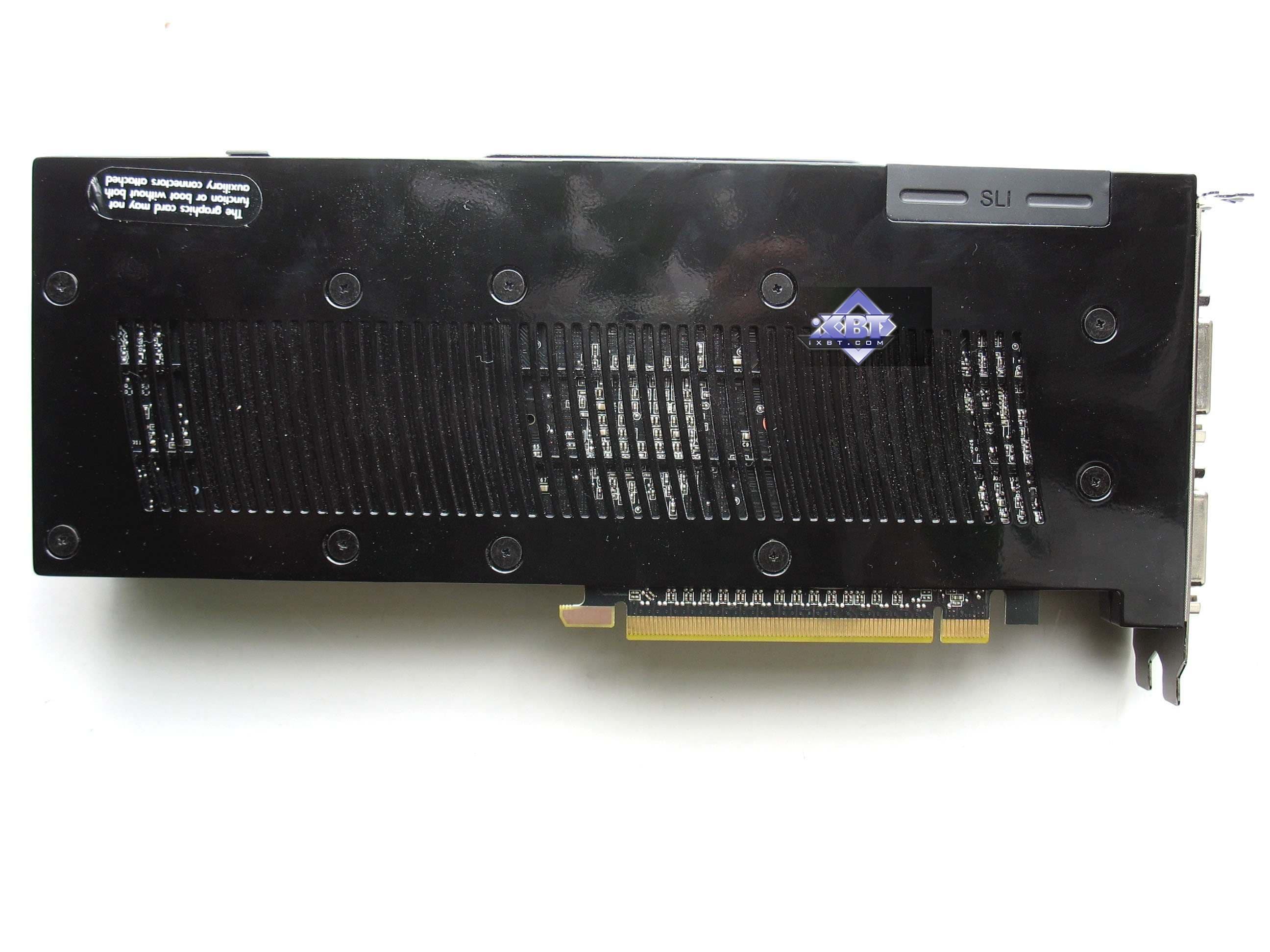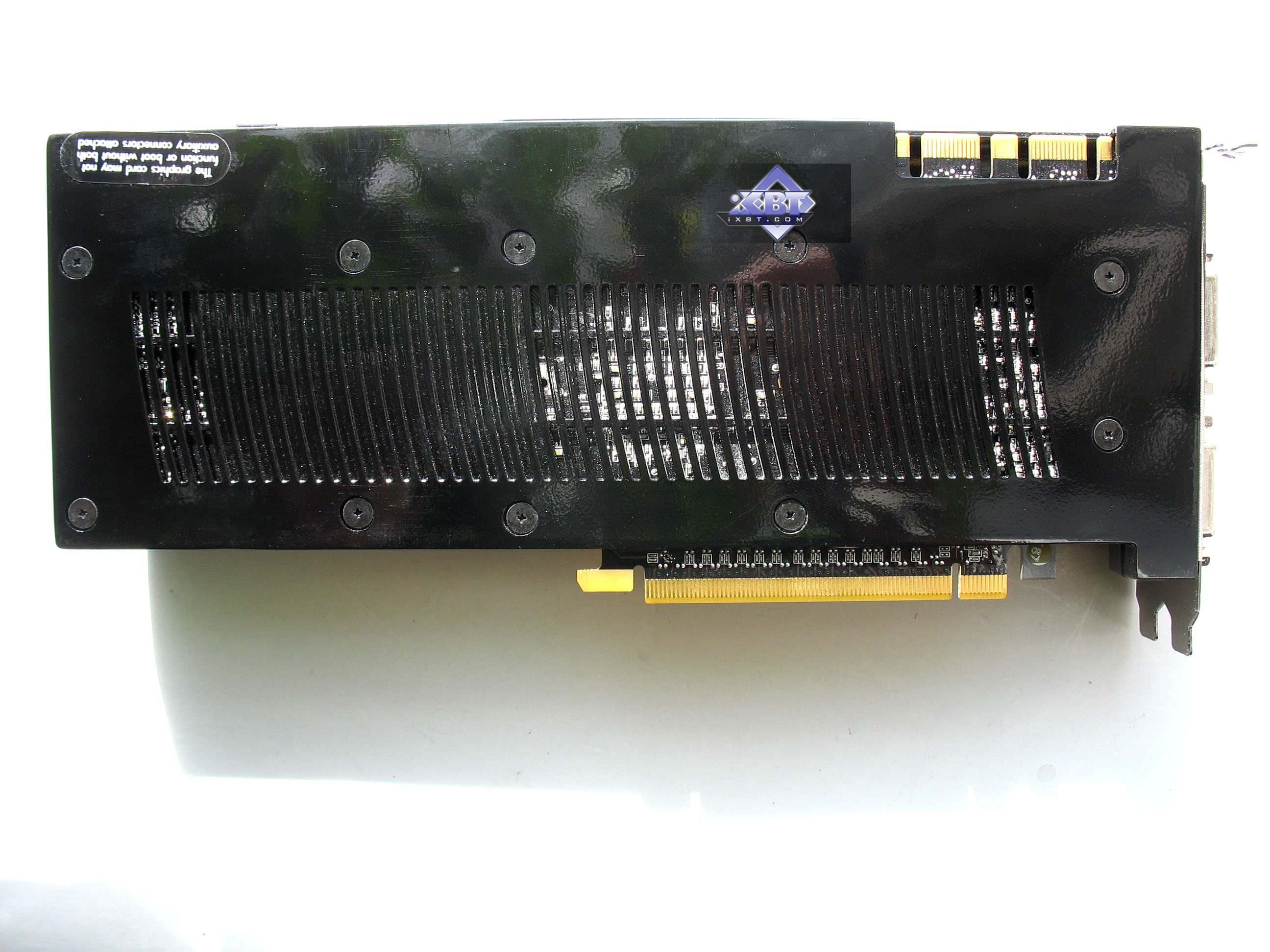 Напоминаем еще раз важный момент: длина ускорителя — 270 мм, как у 8800 GTX/Ultra, поэтому в корпусе должно быть достаточно места для установки такой конструкции. А также обратим внимание на ширину кожуха, которая неизменна вдоль всей длины, а, следовательно, на материнской плате за PCI-E x16 разъемом не должно быть портов и высоких конденсаторов, и на ширину 30 мм (то есть не только за самим слотом PCI-E, но за соседним с ним не должно быть их высоких частей на системной плате).