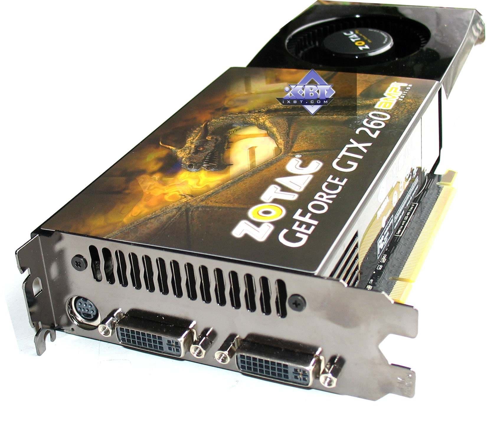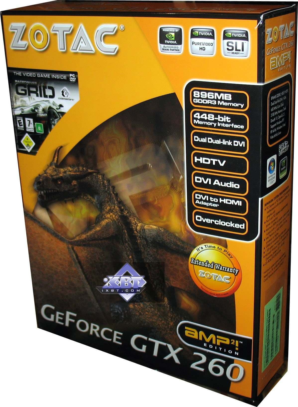 Zotac Geforce GTX 260 AMP2! 896MB PCI-E — аналогичный продукт по сути, производительность примерно такая же. Однако комплект поставки с бонусом и упаковка более привлекательная. А также имеется 5-летняя гарантия.