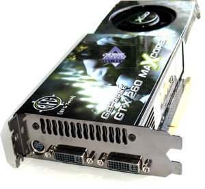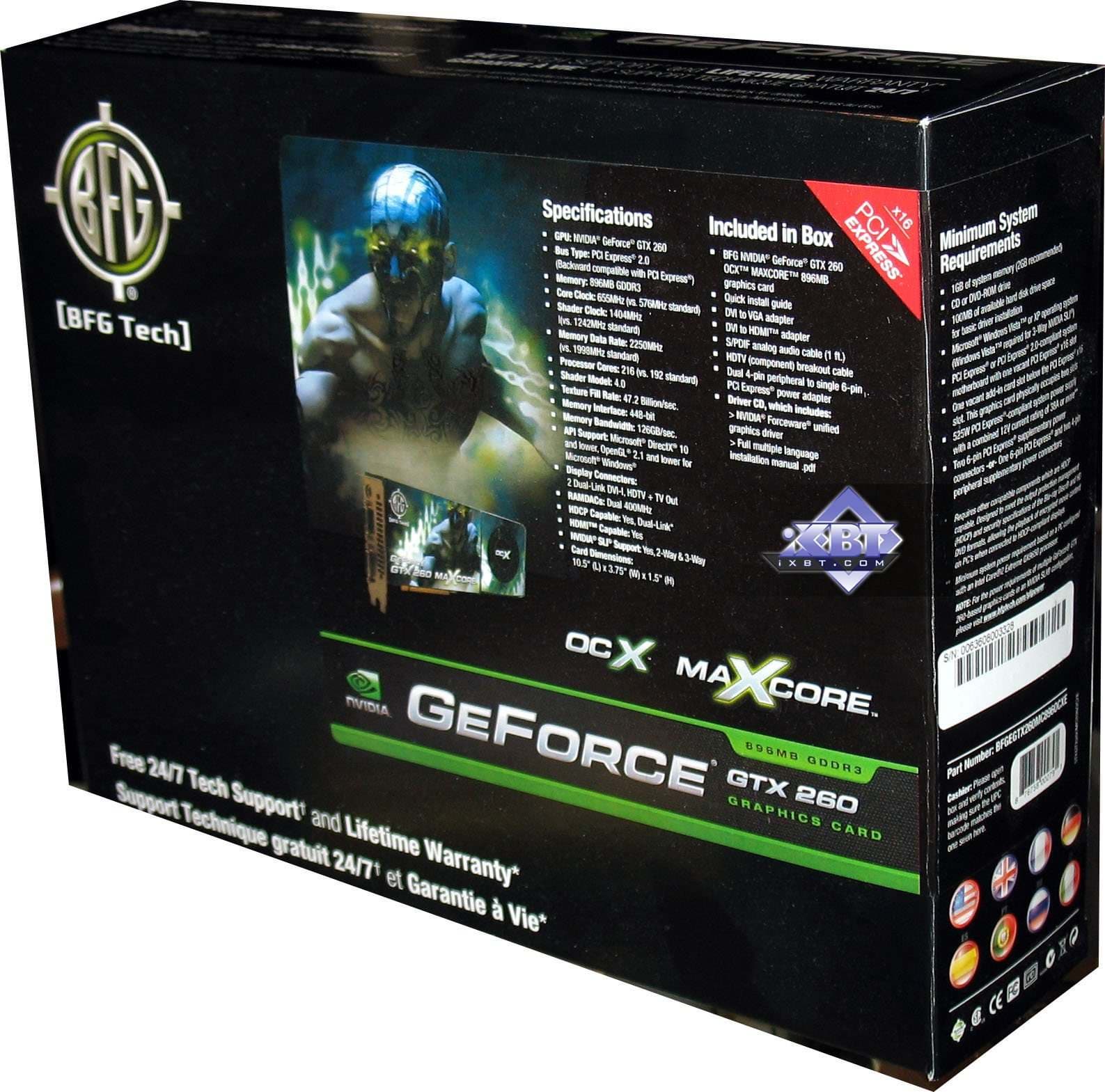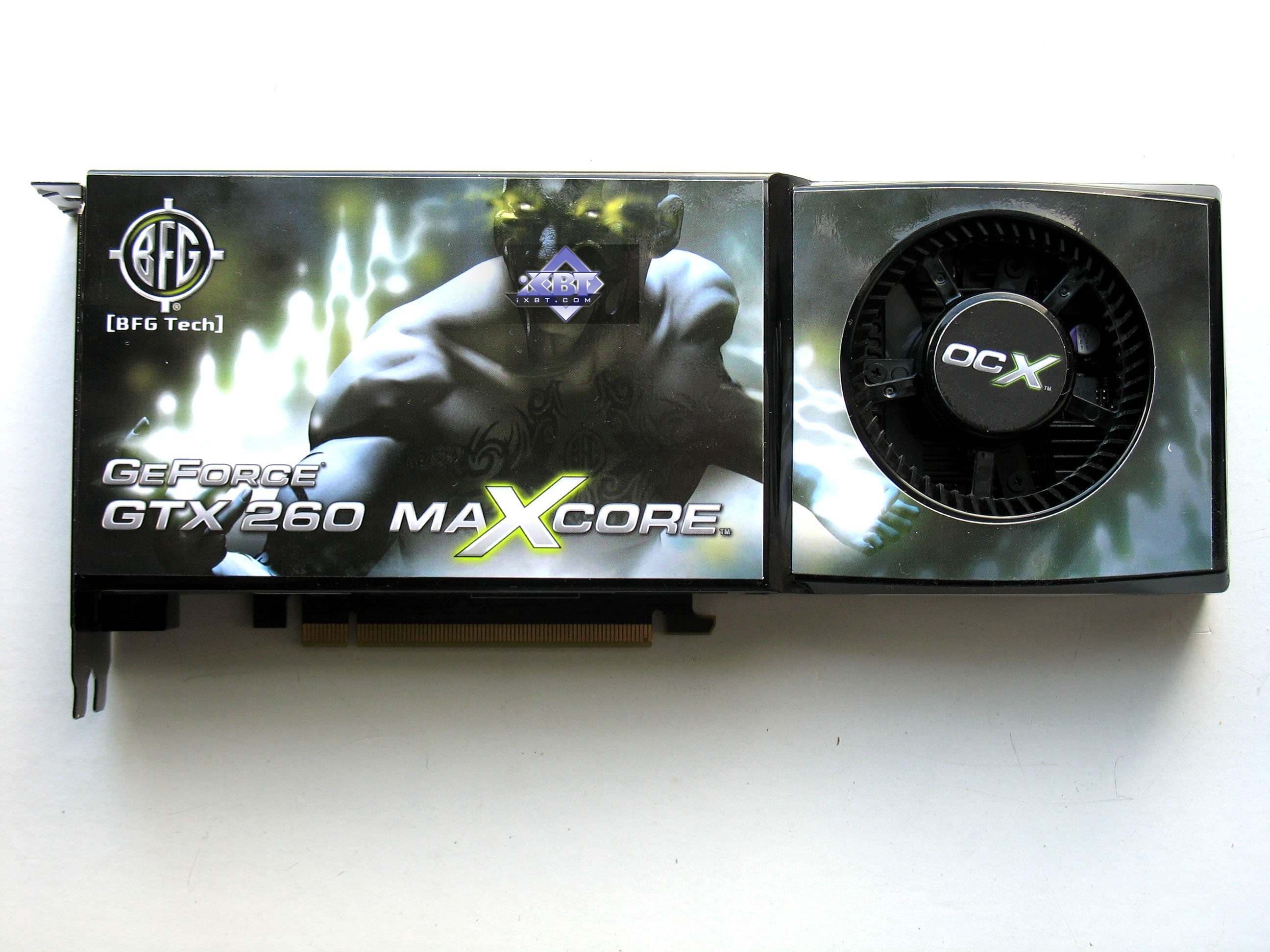 BFG Geforce GTX 260 Maxcore OCX 896MB PCI-E — референс-карта с наклейкой, как и все остальные продукты такого уровня. Продемонстрировала очень хорошие результаты, подчас догоняя GTX 280, который явно дороже. Омрачает впечатление лишь упаковка. Но напомню про 10-летнюю гарантию на продукты этой фирмы.