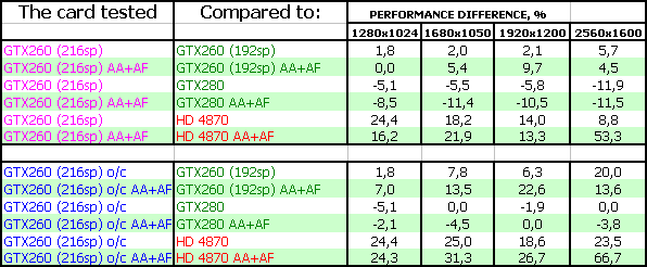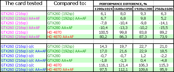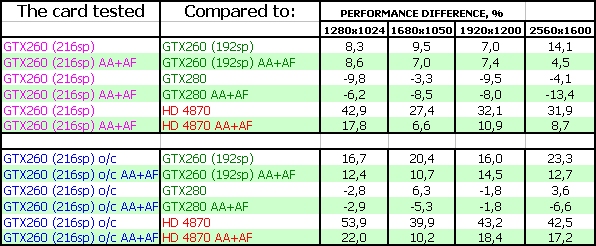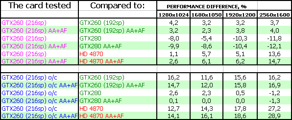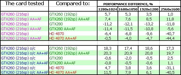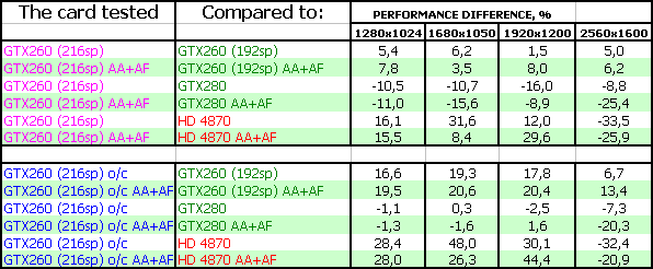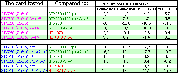 Прежде всего хочу заметить, что я провел тесты нового GTX260 и на штатных частотах, и именно они показали, что разница весьма мала, в среднем 7-8%. То есть прибавка в 24 потоковых процессора дала не так много, как может быть хотелось. Также стоит заметить, что в диаграммах против названий GTX 260 в скобках отмечено количество потоковых процессоров (192sp) или (216sp). Ну и последнее такое замечание, что продукт от Zotac по частотам ядра равен своему аналогу от BFG, а по частоте работы памяти чуть ниже, однако реально это сказалось на производительности в пределах погрешности измерений, поэтому я не стал отдельно показывать обе карты, ибо нет смысла.