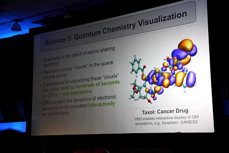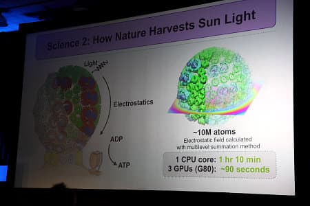 Его обширное выступление было целиком посвящено тому, как вычисления на GPU используются в науке. И оказывается, что исследователи нашли уже очень много применений GPU вычислениям. Не будем описывать всё выступление, его всегда можно посмотреть в онлайне на сайте Nvidia, а только ознакомим читателей с наиболее интересными слайдами с практическими данными о производительности расчётов на GPU.