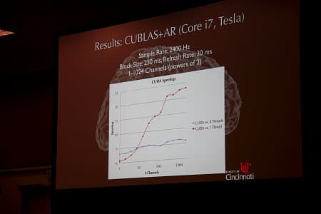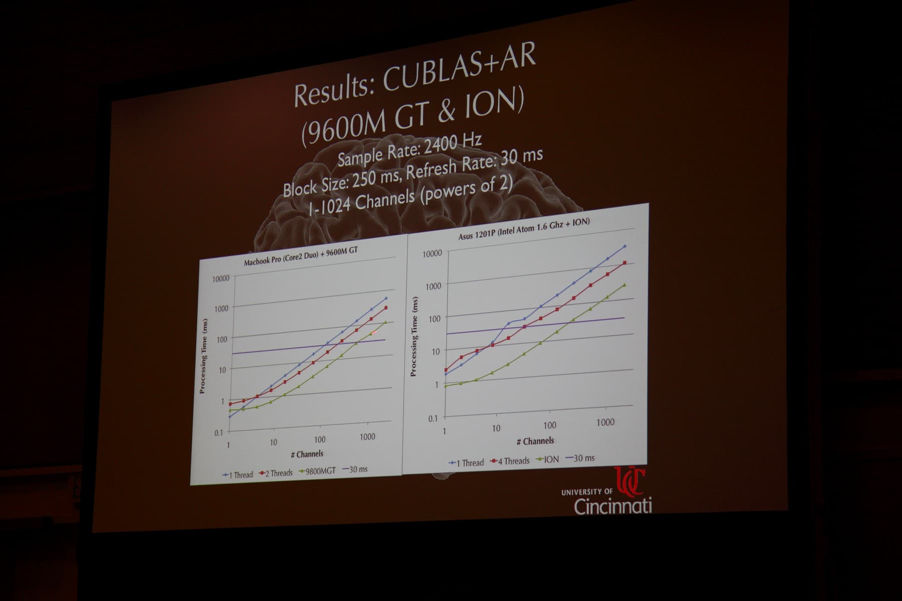 Каким образом всё это касается GPU? Графический процессор помогает в расчётах, как всегда. Ведь сигналов с мозга снимается довольно много и всё это нужно обрабатывать в реальном времени, а желательно ещё и увеличить количество каналов по сравнению с тем, что рассчитывается на CPU. Да и перед специализированным аппаратным обеспечением у GPU есть определённые преимущества.