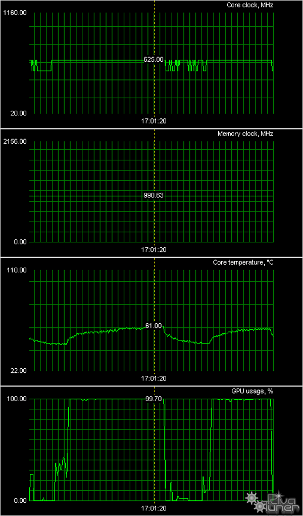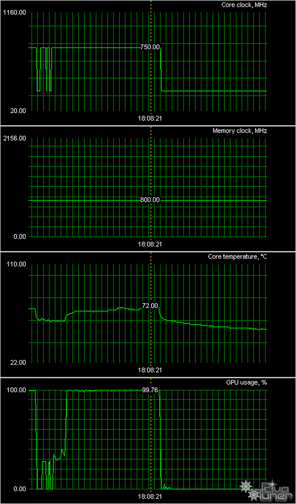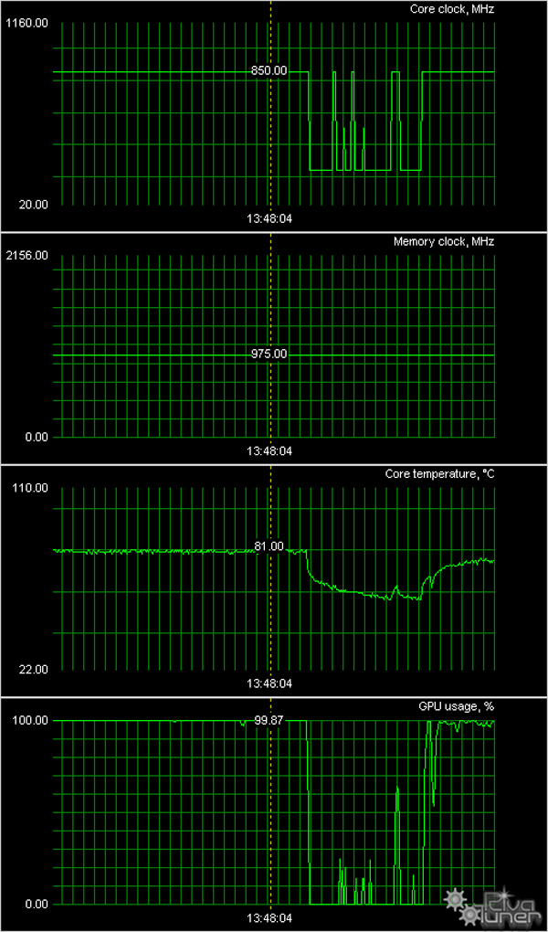Мы провели исследование температурного режима с помощью утилиты RivaTuner (автор А.Николайчук AKA Unwinder) и получили следующие результаты: