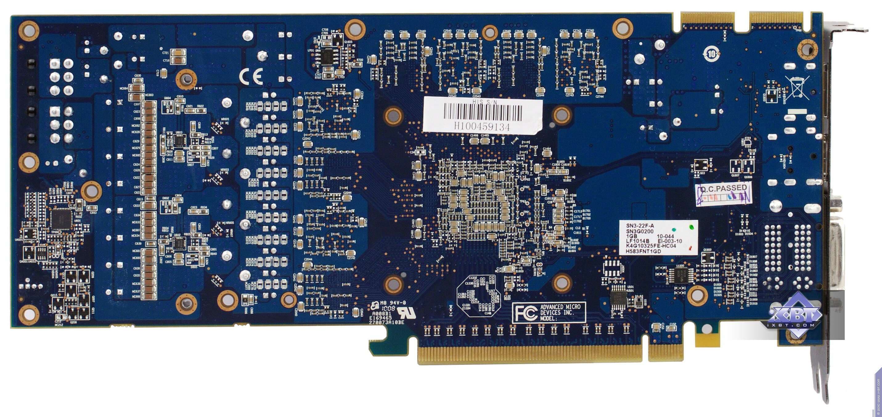 Что касается 5770, то тут реально лишь конфигурация размещения микросхем памяти вокруг ядра напоминает об эталонном дизайне, в остальном PCB совсем иная, и силовой блок вообще смещен с конца карты к ее началу (к гнездам вывода). Это решение кажется странным, так как блок питания всегда вызывает определенные помехи и наводки, и ставить его рядом с выводами — не лучшее решение. Однако возможно что инженерам HIS виднее, и данная разводка обеспечивает стабильность работы ускорителя, обеспечивая при этом меньшую себестомость чем эталонный дизайн.