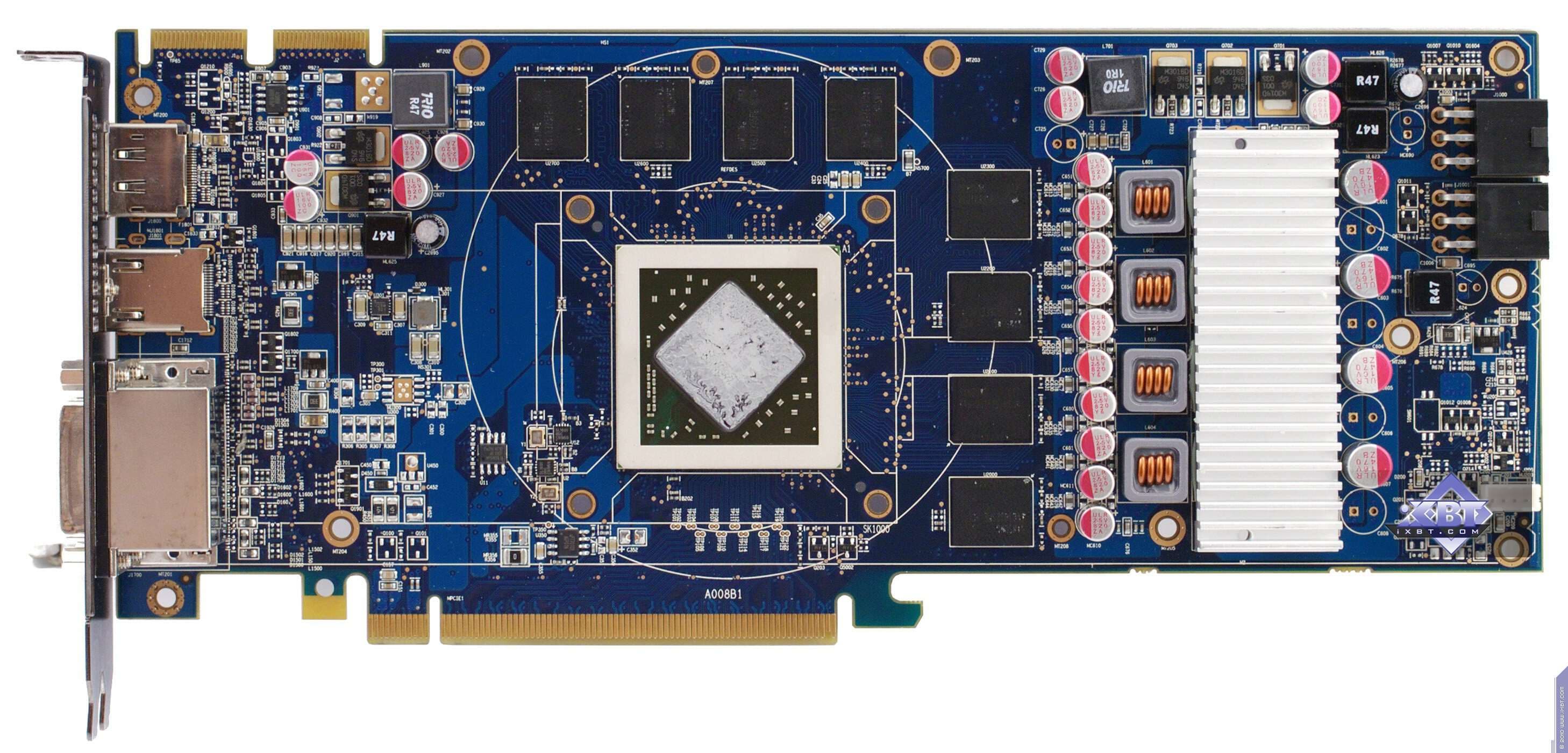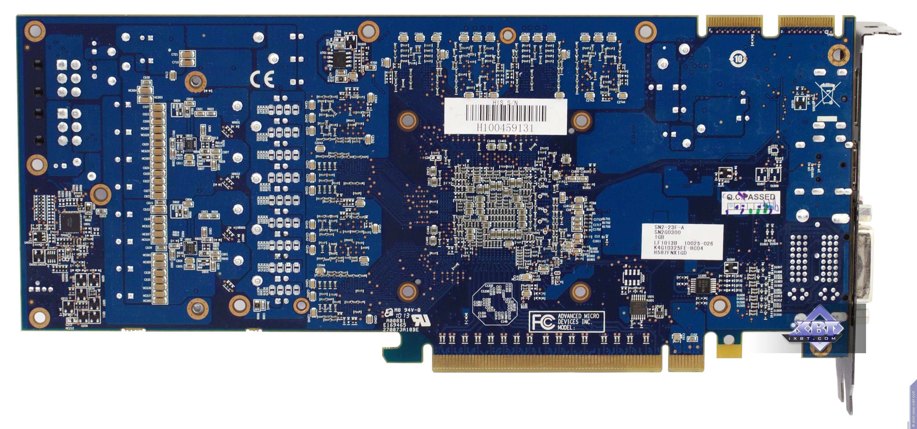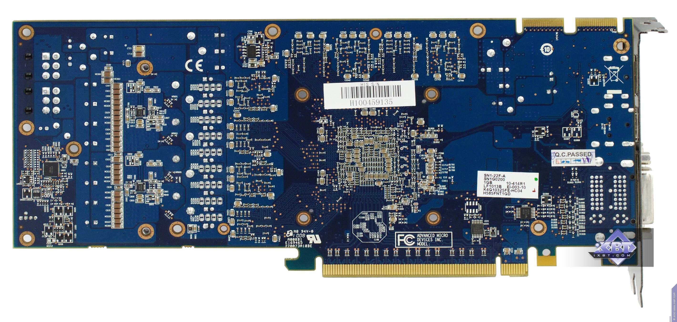 Читатели могут видеть, что все три видеокарты 5830/5850/5870 имеют одну и ту же по сути своей PCB, так как все три видеокарты базируются на одном и том же ядре, разница лишь в его урезанности и частотах. А шина обмена с памятью у всех трех карт единая — 256 бит. При этом данная печатная плата лишь основана на эталонном дизайне, а в конструктив внесено много изменений, касающихся блока питания и обвязок микросхем памяти. Надеемся, что это сделано с целью улучшения стабильности работы карт. Единственный недостаток карт — зачем-то разъемы внешнего питания с верхней части карты перенесены на хвостовую часть, и, как следствие, автоматически длина видеокарты увеличилась на длину разъемов питания от БП компьютера. А это уже не очень хорошо, ибо и так размеры карт немаленькие, и не каждый корпус позволит установить такие ускорители.