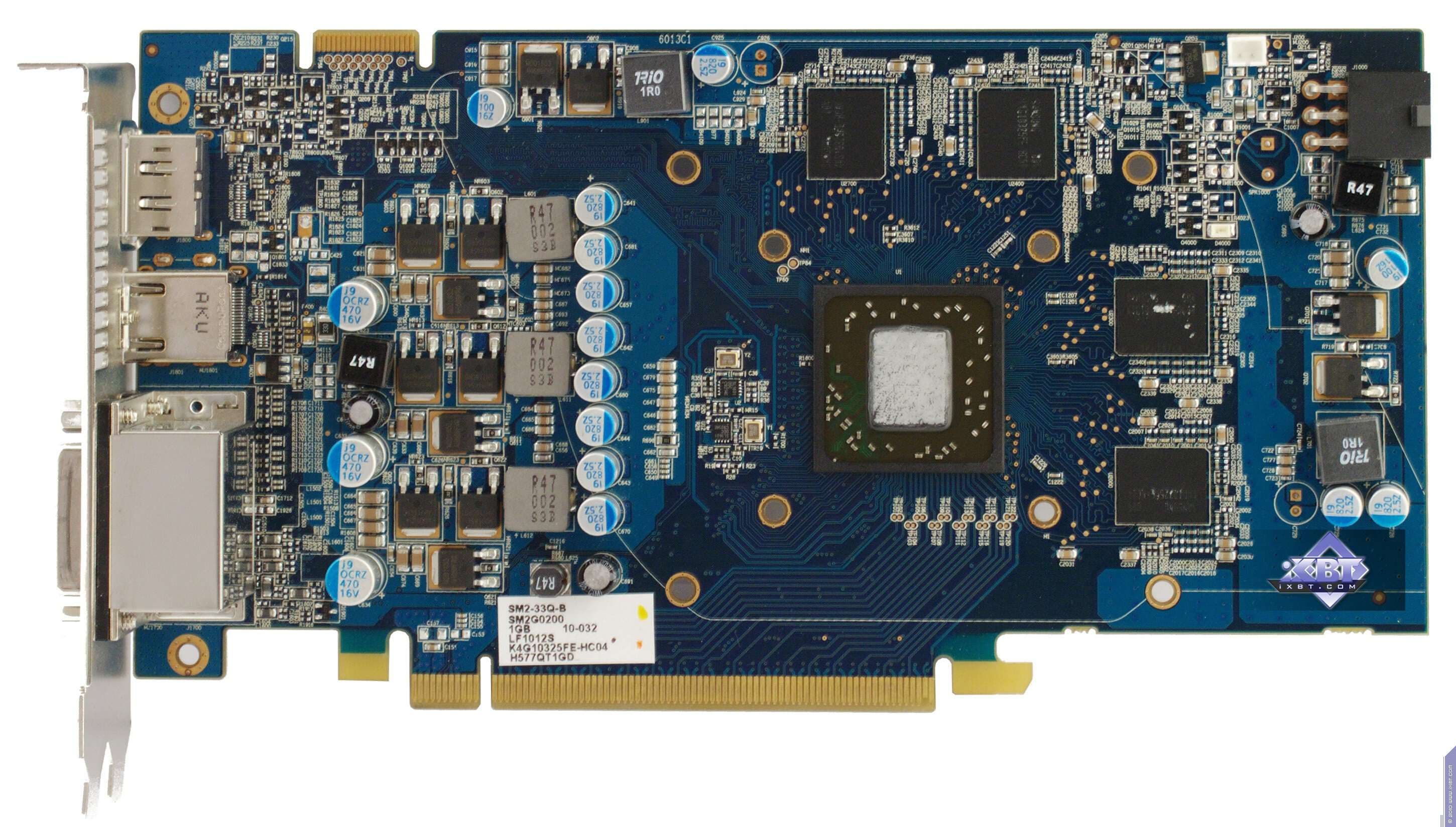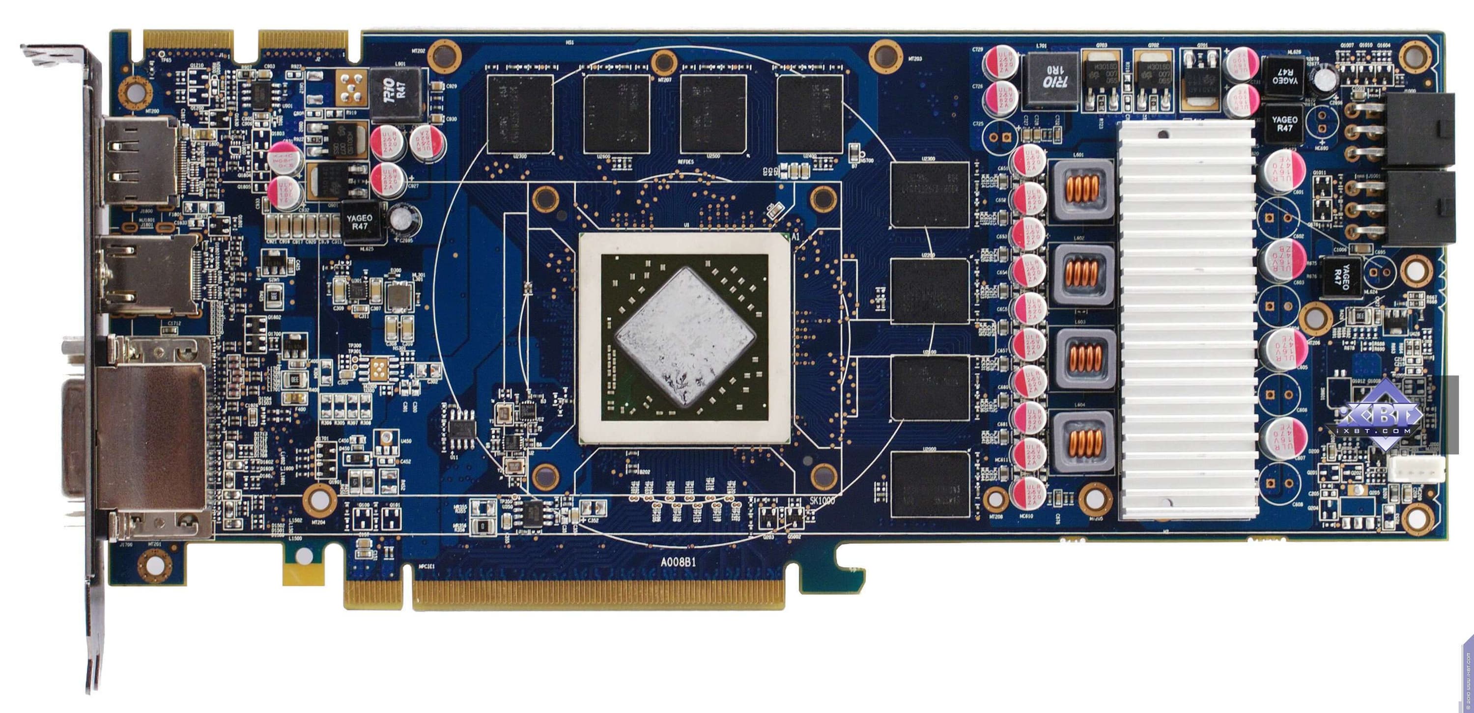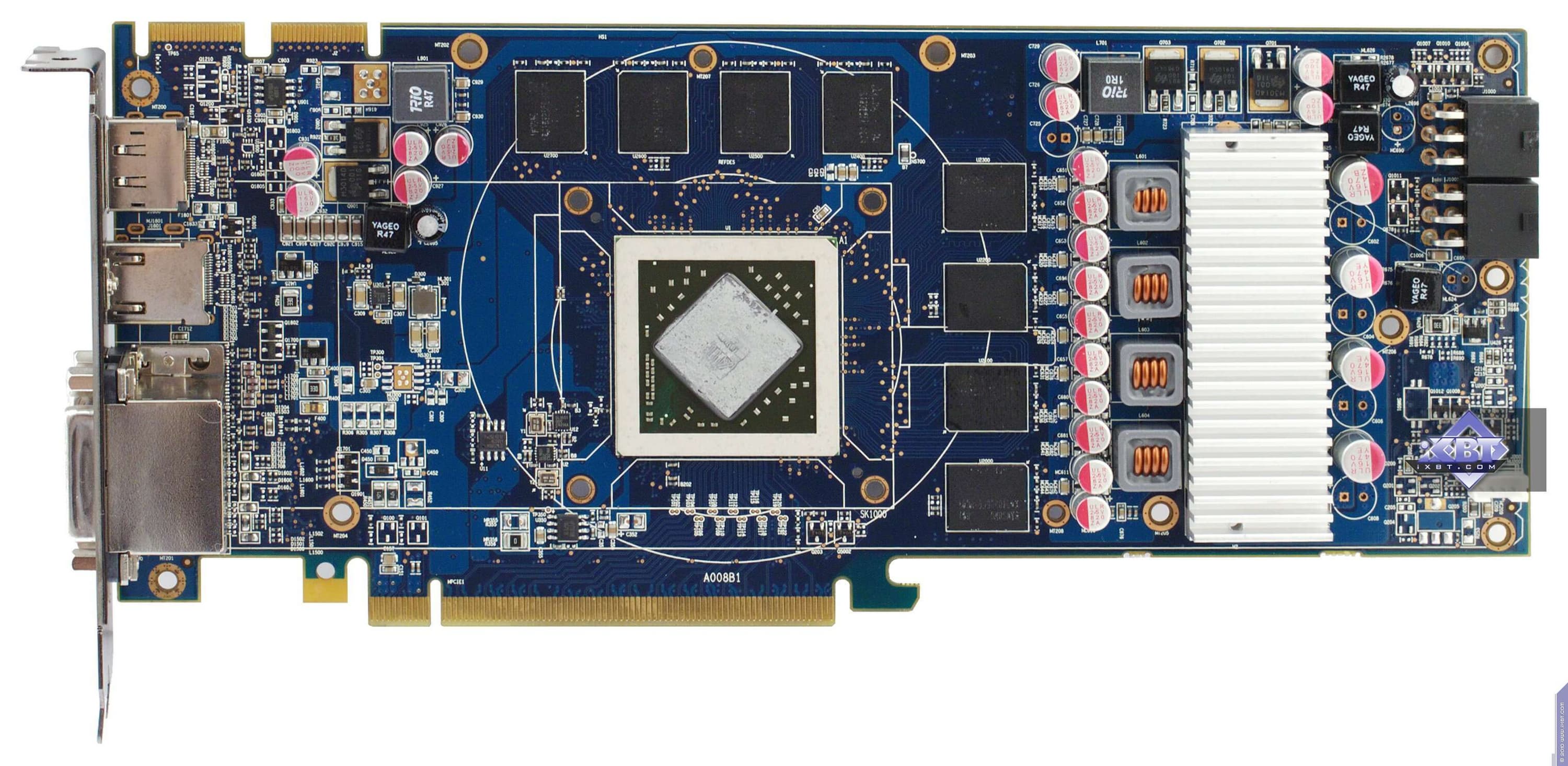 Читатели могут видеть, что все три видеокарты 5830/5850/5870 имеют одну и ту же по сути своей PCB, так как все три видеокарты базируются на одном и том же ядре, разница лишь в его урезанности и частотах. А шина обмена с памятью у всех трех карт единая — 256 бит. При этом данная печатная плата лишь основана на эталонном дизайне, а в конструктив внесено много изменений, касающихся блока питания и обвязок микросхем памяти. Надеемся, что это сделано с целью улучшения стабильности работы карт. Единственный недостаток карт — зачем-то разъемы внешнего питания с верхней части карты перенесены на хвостовую часть, и, как следствие, автоматически длина видеокарты увеличилась на длину разъемов питания от БП компьютера. А это уже не очень хорошо, ибо и так размеры карт немаленькие, и не каждый корпус позволит установить такие ускорители.