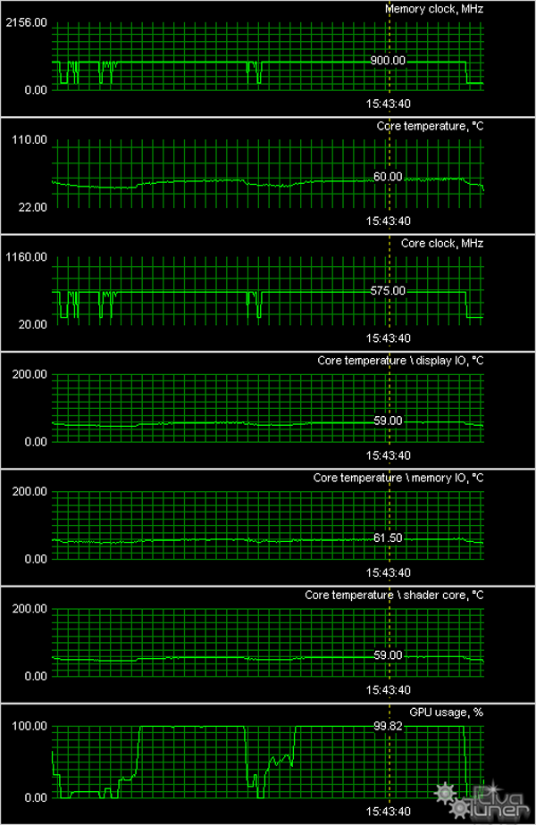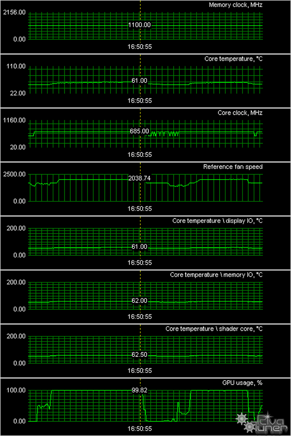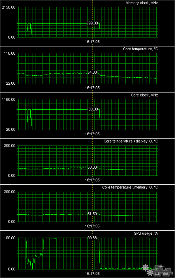 Для всех карт, кроме 4870 Х2 (по нему уже было исследование) мы провели исследование температурного режима с помощью утилиты RivaTuner (автор А. Николайчук AKA Unwinder) и получили следующие результаты:
