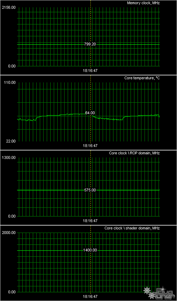 Для карт серии 9500 GT мы провели исследование температурного режима с помощью утилиты RivaTuner (автор А.Николайчук AKA Unwinder) и получили следующие результаты: