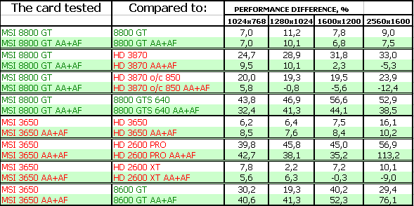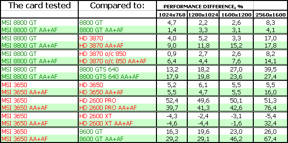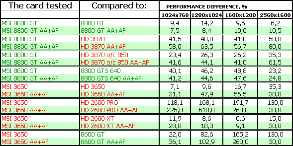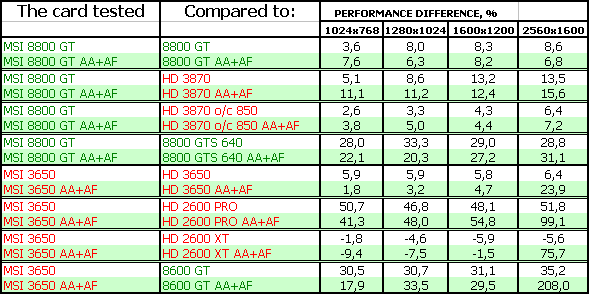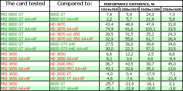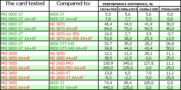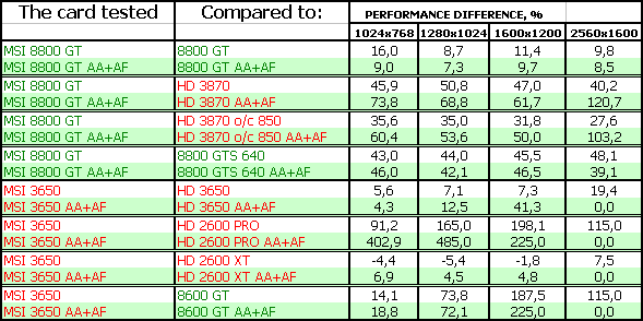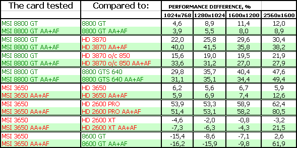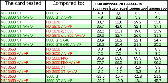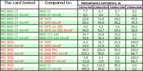 В-третьих, посмотрим на тесты рассматриваемых сегодня карт. Анализ каждого теста проводить не будем, в конце тестов подведем итоги. Все тесты разбиты как бы на две группы (более яркие цвета — это 8800 и его конкуренты, более пастельные тона — 3650 и его конкуренты). Для любителей покричать, что используются старые драйверы версии 169.хх, скажу, что для 8800-й серии карт компания Nvidia на начало марта 2008 года более свежей версии драйвера НЕ ВЫПУСКАЛА, ни в виде бета-версии, ни в виде релиза. Использовать всякие «левые» версии с подделанными файлами мы не будем по понятным причинам (90% пользователей не будет их использовать).