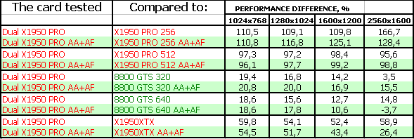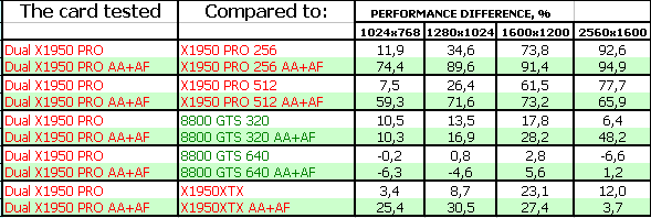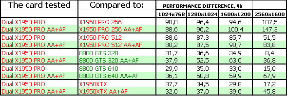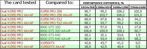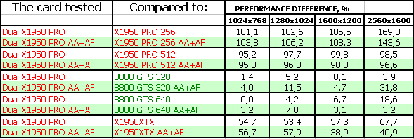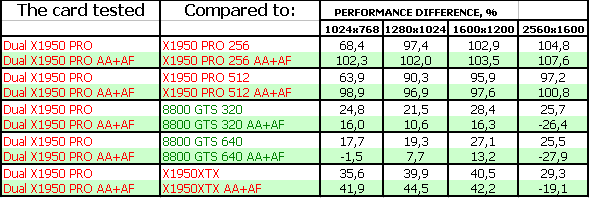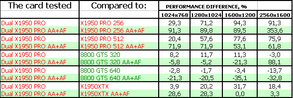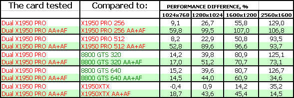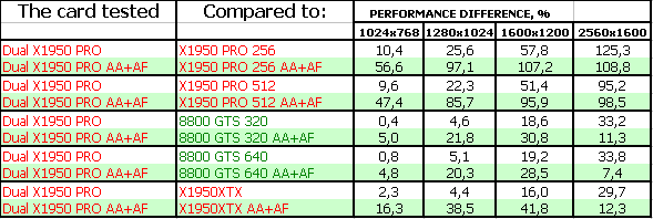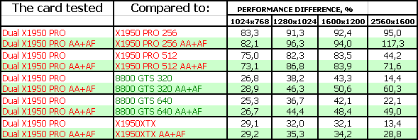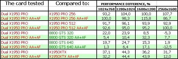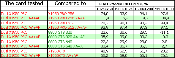 Приросты относитель одиночных X1950 PRO также впечатляют, как и победа в целом. Минусы в 2560х1600 можно не учитывать, там играбельность уже минимальна.