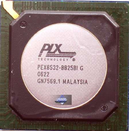 Выше был упомянут некий PCI-E коммутатор. На плате стоит микросхема, которая занимается разделением (ну если упростить все технические нюансы) общей шины x16 на две x8, чтобы каждой карте внутри сдвоенного ускорителя досталось по этому PCI-E х8.
