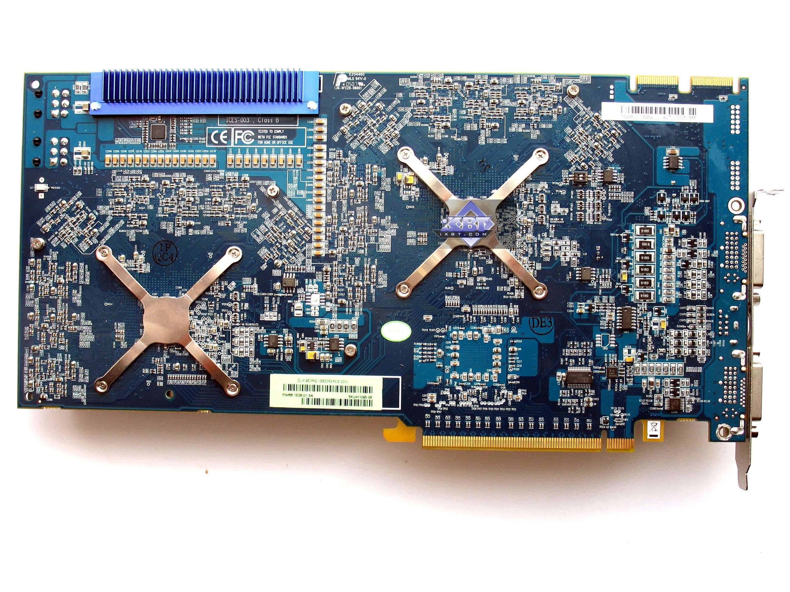 Отдел проектирования не удосужился подумать над оптимизацией и более компактным размещением всех элементов, ведь микросхемам памяти, работающим на штатных частотах, охлаждение особо не требуется, поэтому их вполне можно было разместить на оборотной стороне PCB (часть из них). А в данном случае, как и в тот раз с Asus Dual 6800GT, просто тупо объединили две имеющиеся уже PCB от X1950 PRO, разместив их по диагонали, чтобы было место для блока питания, поэтому выросла не только длина карты, но и ее высота. Вот в нашей лаборатории эта плата не уместилась в стендовом корпусе, и потому пришлось все из него вынимать для проведения тестов.