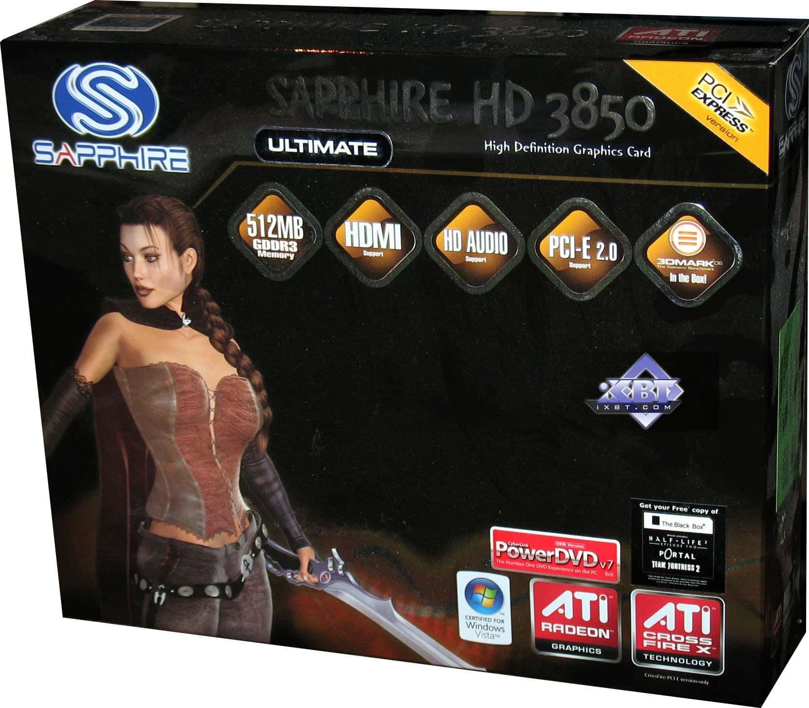 Sappphire HD 3850 Ultimate 512MB PCI-E — тоже очень хороший продукт для своей цены. Хоть частоты и не повышены, но зато кулер весьма хорош, и нагрев в целом невелик. Все остальное, сказанное выше для первого продукта, справедливо и тут. А что касается бонуса, то в данном случае поставляются диски с ПО: 3Dmark, DVD Suite. Это дело читателей — нужно им это все или нет.