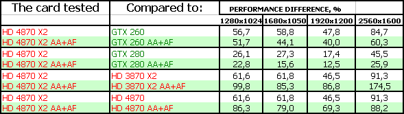 Очевидно, что продукт теоретически может быть в 2 раза сильнее 4870, но фактически это от 1,5 до 1,8 раза, иногда меньше. Да, глядя на графики и прекрасные цифры приростов, надо иметь в виду, что у двухпроцессорных карт (хоть от AMD, хоть от Nvidia) есть большой недостаток: программное управление распределения работы между процессорами, поэтому степень отлаженности и производительность в той или иной игре целиком зависит от того, как тщательно поработали над соответствующим драйвером программисты. И есть много игр, где эти все супермощные двухпроцессорные гиганты демонстрируют низкую скорость, а что хуже всего, еще и лаги, дергания. Что бывает, когда какой-то процессор освободился и получает легкую задачу, а второй занят капитально, и скорость проседает. И получается огромный разброс мгновенного FPS (от 5 до 60 или выше). Понятно, что визуально это будет выглядеть, как лаги и задержки, что некоторых геймеров может сильно раздражать.