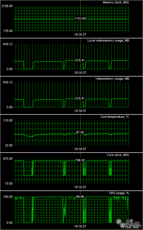 Мы провели исследование температурного режима с помощью утилиты RivaTuner (автор А.Николайчук AKA Unwinder) и получили следующие результаты: