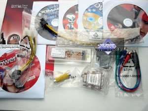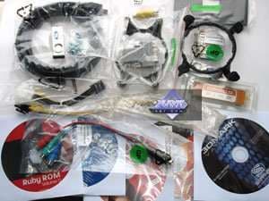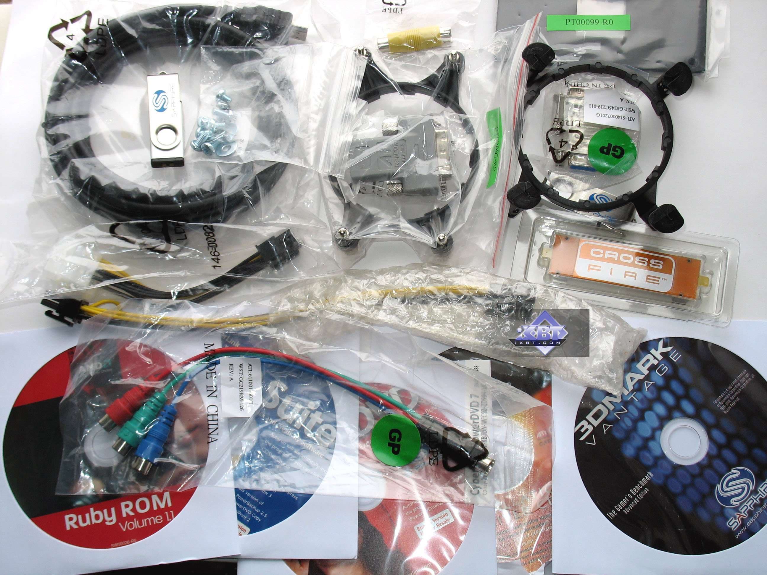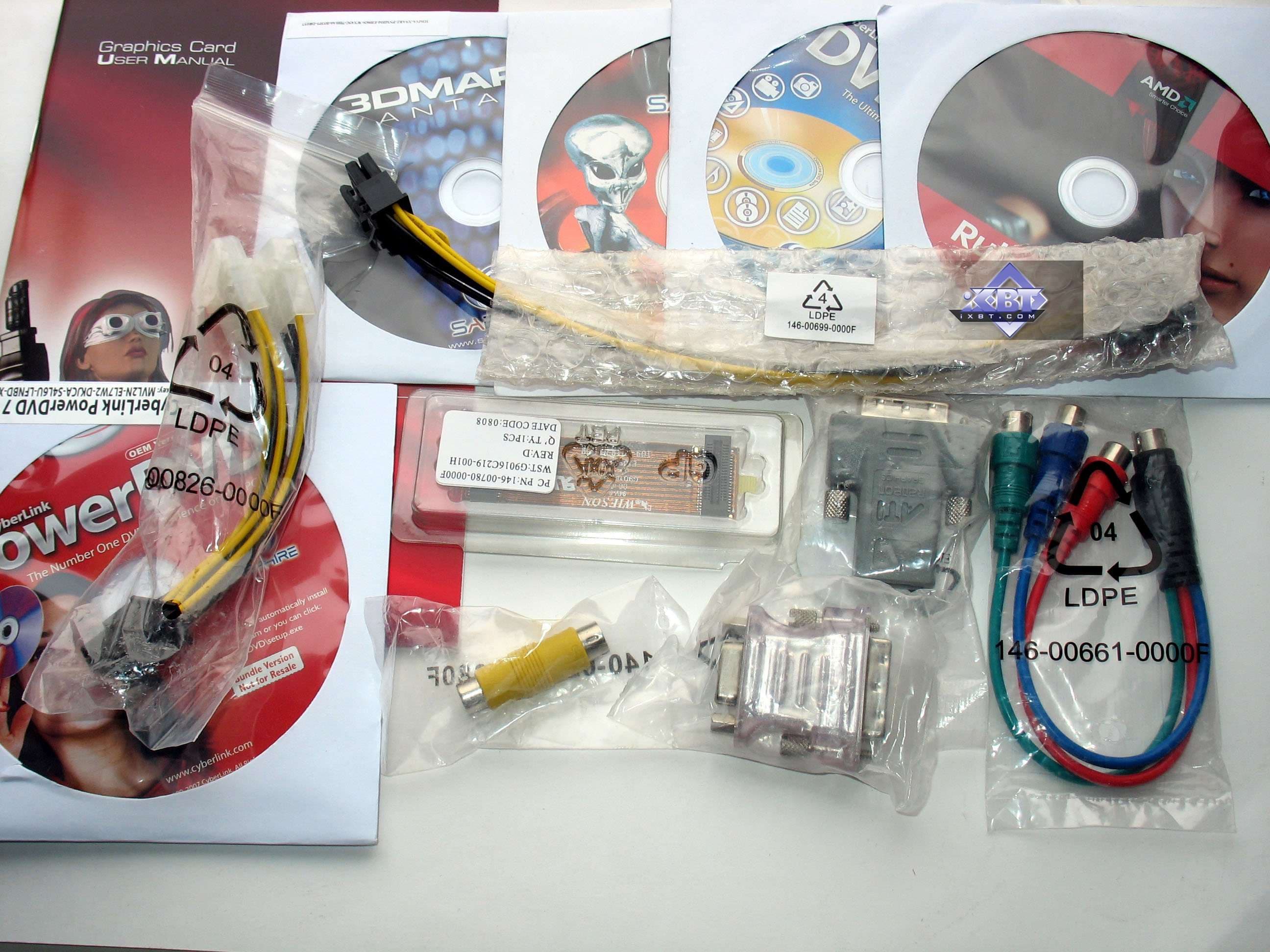 Напомним, что базовый комплект поставки должен включать в себя: руководство пользователя, диск с драйверами и утилитами, переходник-адаптер DVI-to-VGA, DVI-to-HMDI-адаптер, адаптер компонентного вывода (TV-out), мост CrossFire, а также разветвители внешнего питания. Но это все — для рядового ускорителя. Позже мы покажем, что предлагается к каждой карте дополнительно.