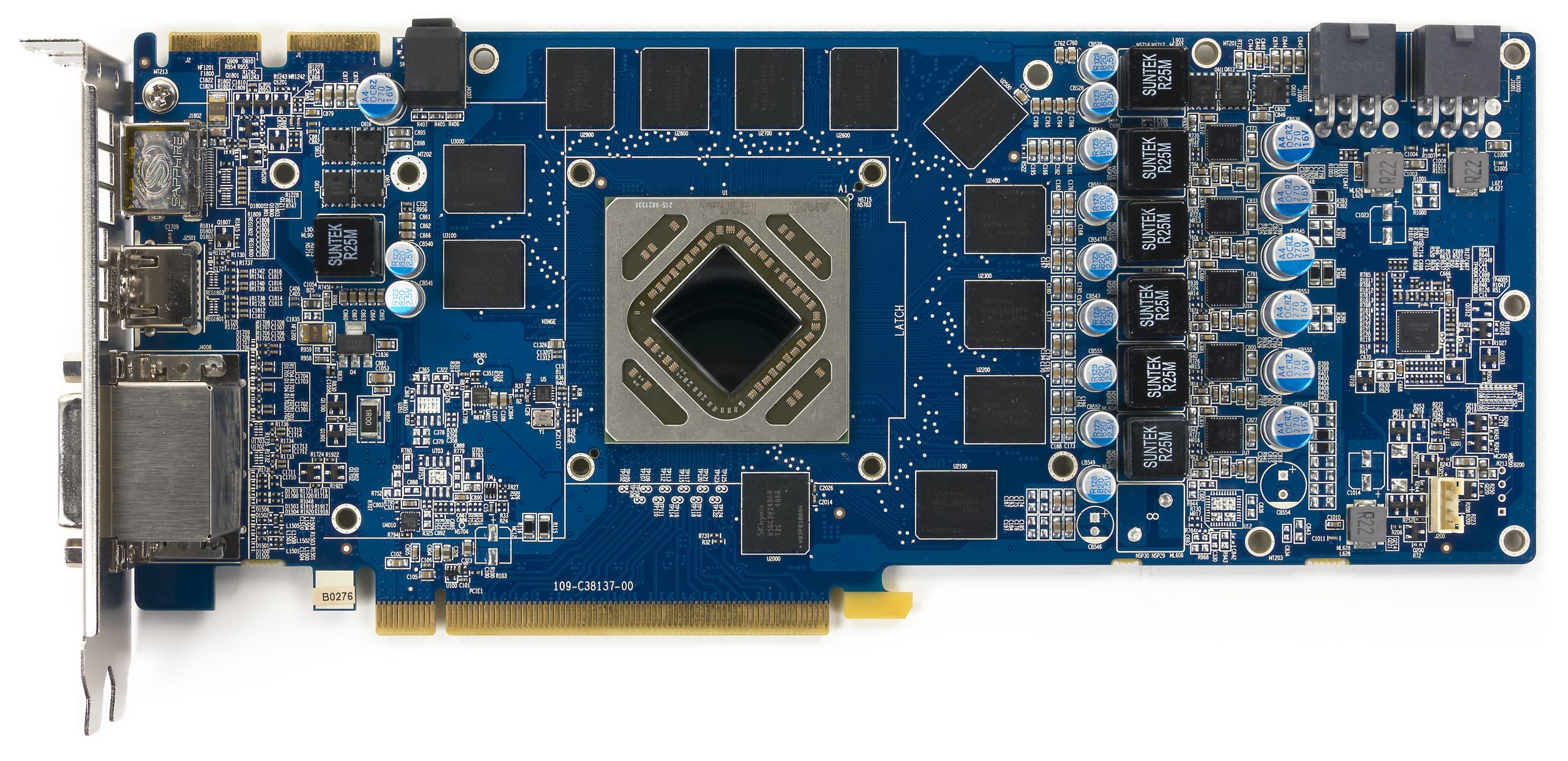 Дизайн этой карты в целом очень схож с эталонным (мы сравниваем с Radeon HD 7950, так как R9 280 — это, по сути, и есть бывший HD 7950 с измененными частотами работы). Немного изменена система питания, она стала 6-фазной для ядра. Главное изменение: комплект видеовыходов для подключения к мониторам. Если референс-карта имеет всего 1 разъем DVI, 2 разъема DP в мини-формате плюс 1 разъем HDMI, то у Sapphire мы видим более сбалансированный и востребованный набор: два DVI, плюс по одному HDMI и DP в полноформатных вариантах. Следует напомнить, что по умолчанию видеокарты Radeon семейств HD/R обладают способностью вывода картинки на 3 монитора одновременно (AMD Eyefinity), а все последние продукты семейства R9 могут выводить изображение на 4 монитора.