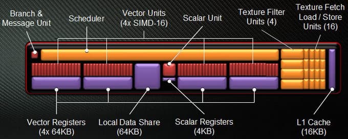 Каждый блок GCN имеет выделенное локальное хранилище данных для объёмом 64 КБ для обмена данными или расширения локального стека для регистров. Также блок имеет в своём составе и кэш-память первого уровня с возможностью чтения и записи, и полноценный текстурный конвейер (блоки выборки и фильтрации). Поэтому новый вычислительный блок способен работать самостоятельно, без центрального планировщика, который в предыдущих архитектурах отвечал за распределение работы по блокам. Теперь каждый из блоков GCN способен заниматься планированием и распределением команд сам, один вычислительный блок может исполнять до 32 разных потоков команд, которые могут быть из разных виртуальных адресных пространств в памяти и полностью защищены и независимы друг от друга.