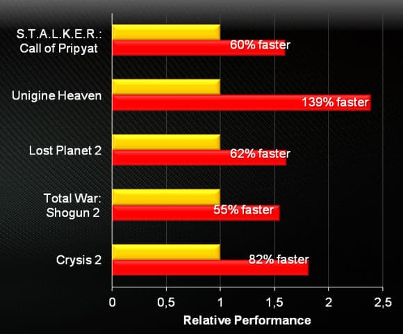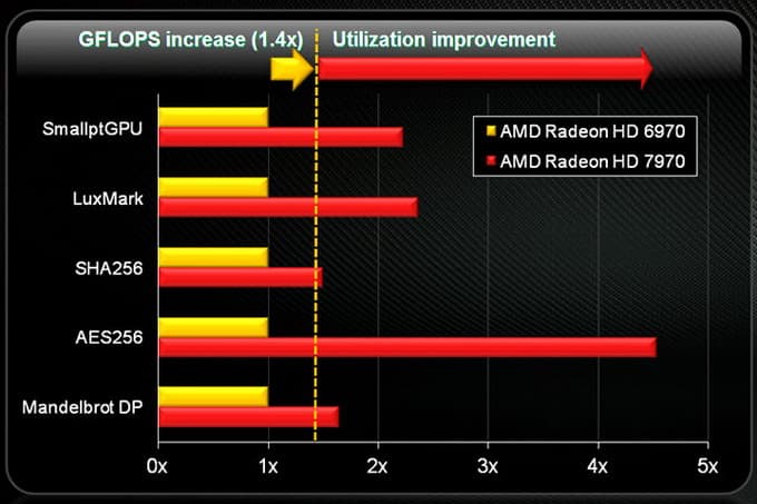Вертикальной прерывистой линией на графике отмечена теоретическая разница в производительности, но данные о скорости показывают, что в трёх из пяти задач скорость нового GPU оказалась значительно выше. Это вызвано всеми изменениями, направленными на увеличение эффективности: уход от VLIW, наличие планировщика в каждом вычислительном блоке, улучшенное кэширование и т. п.