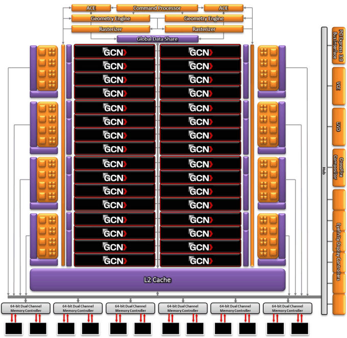 - 32 вычислительных блока GCN, включающих 128 SIMD-ядер, состоящих в целом из 2048 ALU для расчётов с плавающей запятой (целочисленные и плавающие форматы, поддержка точности FP32 и FP64 в рамках стандарта IEEE 754)