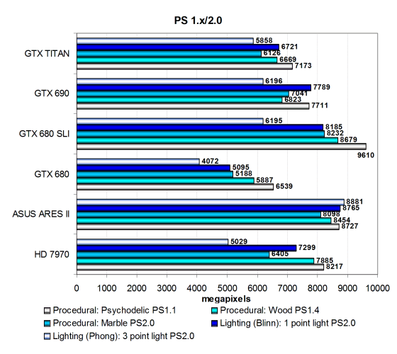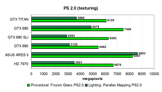В тесте простого бампмаппинга все платы упираются в ПСП, скорее всего, и результат новой видеокарты Nvidia примерно соответствует скорости Radeon HD 7970. Новинка от компании Nvidia опережает младшую сестру на треть и уступает двухчиповой модели — Geforce GTX 690, все в соответствии с теорией. Во втором подтесте с более сложными попиксельными расчетами все примерно так же, по скорости плата Titan расположилась между GTX 680 и GTX 690 и примерно там же находится единственный соперник от компании AMD. Эффективность выполнения сложных математических вычислений в пиксельных шейдерах у чипов архитектуры GCN несколько выше, ведь GK110 гораздо сложнее Tahiti.