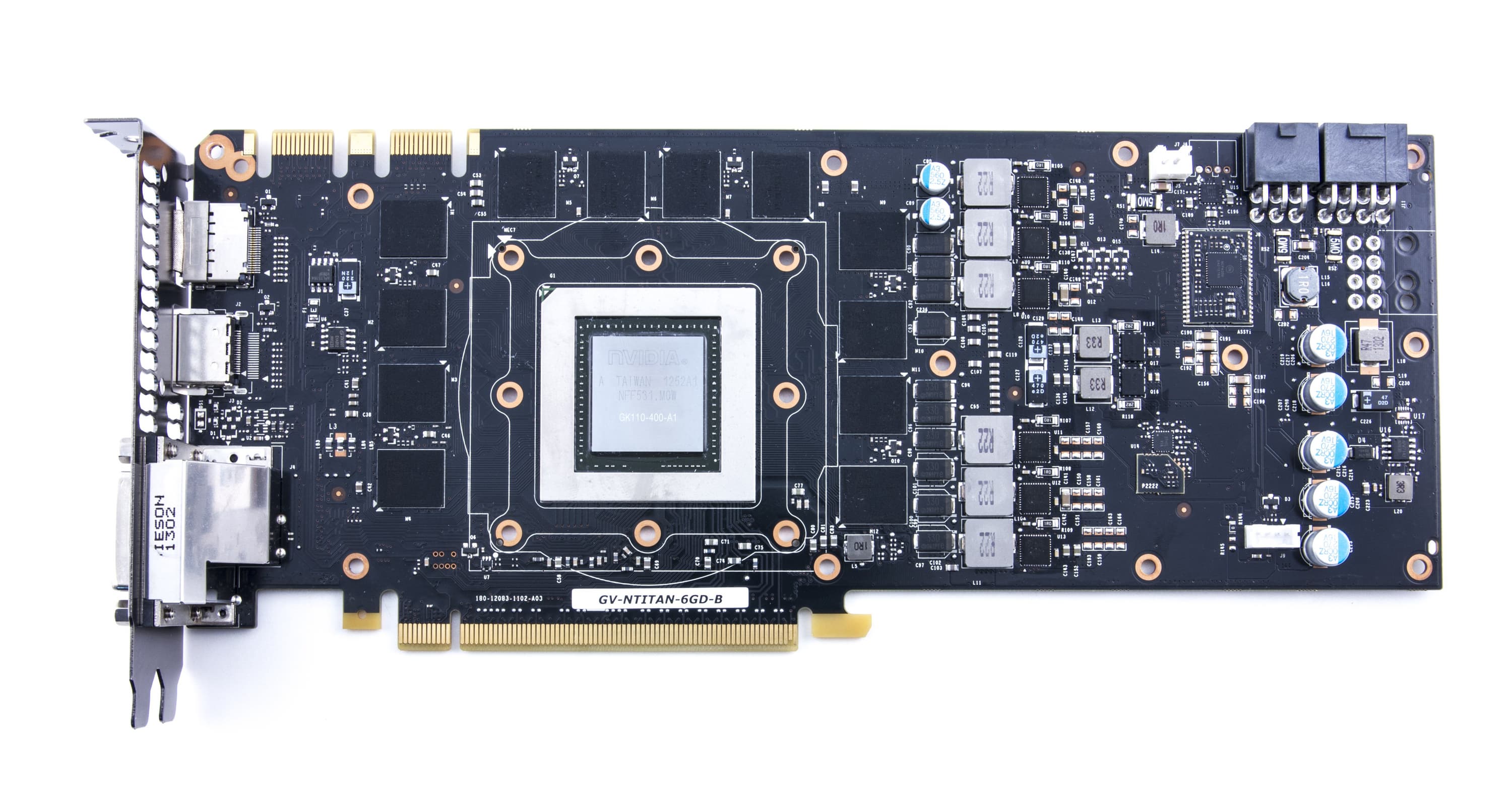 Как мы видим, в целом размеры карты не выходят за рамки принятых стандартов для топовых ускорителей: 270×100 мм. Да и занимает она традиционные 2 слота (хотя, по идее, трехслотовые ускорители должны уже стать стандартом, если речь идет о топовых продуктах). PCB у Titan логично отличается от GTX 680, поскольку карты имеют разные как шины обмена с памятью, так и наборы микросхем памяти (у GTX 680 — 256 бит и 8 микросхем, а у Titan — 384 бит и 24 микросхемы). Система питания имеет 6 фаз для ядра и 2 фазы для микросхем памяти. Управляется БП цифровым контроллером NCP 4206 компании On Semiconductor.