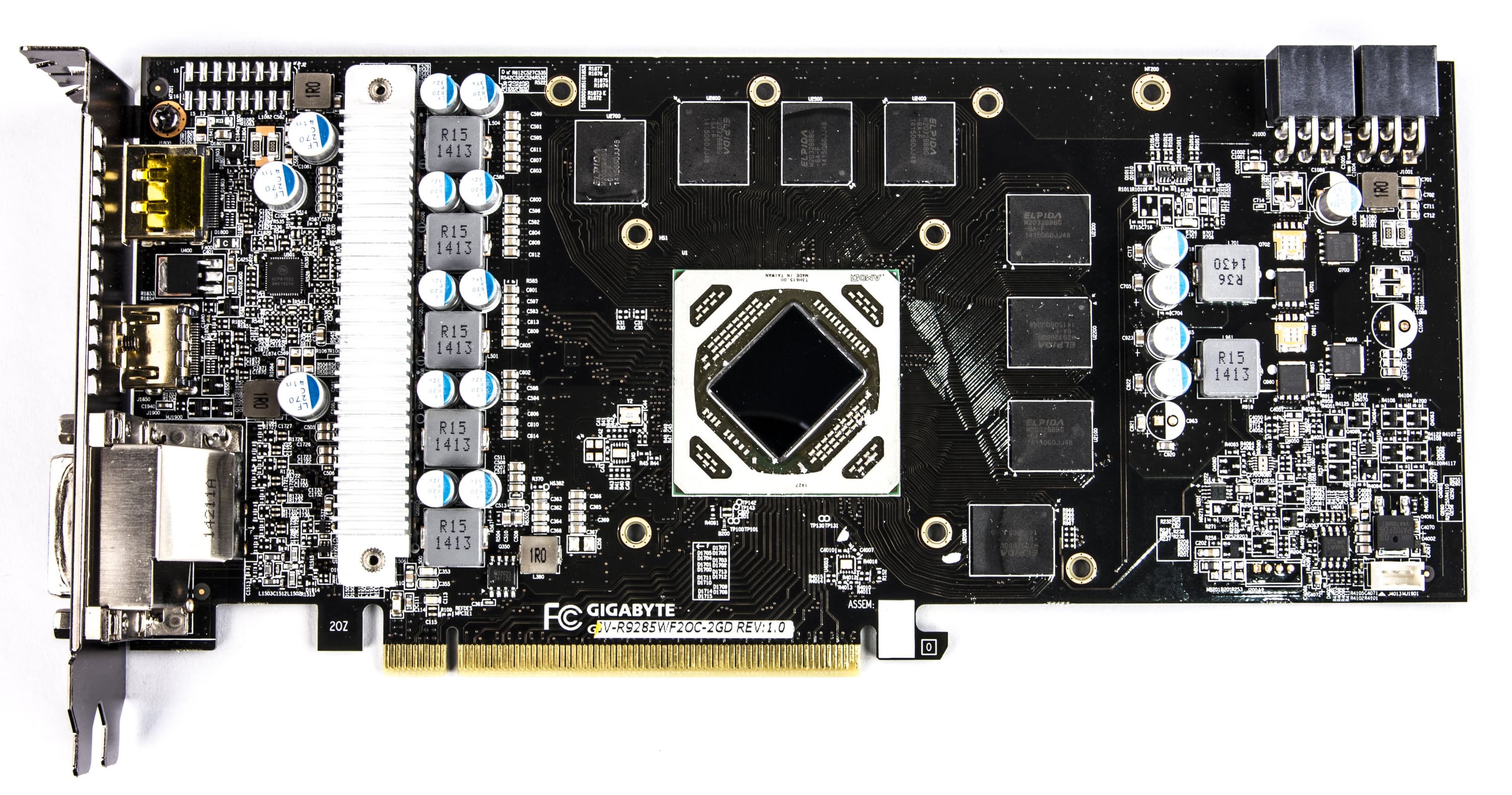 С первого взгляда понятно, что 280 от 285 отличаются шиной обмена с памятью. У R9 285 она ужалась до 256 бит, вследствие чего суммарный объем памяти снизился с 3 до 2 гигабайт. Поэтому сравнение плат условное: ведь PCB сильно отличаются.