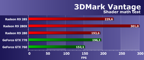 Во втором геометрическом тесте из 3DMark Vantage ситуация совершенно иная, и на этот раз новая Radeon R9 285 оказалась значительно производительнее своей предшественницы R9 280 — разница между их производительностью составила более 20%. Да и R9 280X новинка обогнала! Похоже, что именно в этом тесте больший упор именно в геометрическую производительность, а частично и в скорость заполнения, которая в Tonga также стала выше из-за эффективного сжатия кадрового буфера.