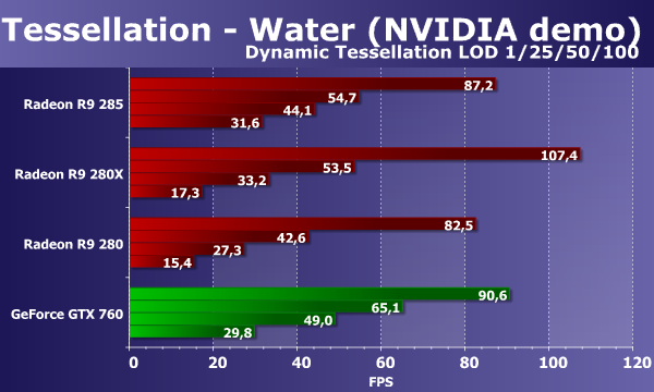 Мы тестируем все видеоплаты при четырех разных коэффициентах тесселяции — в данном случае настройка называется Dynamic Tessellation LOD. Если при самом первом коэффициенте разбиения треугольников, когда скорость не ограничена производительностью геометрических блоков, видеокарты Radeon на чипе Tahiti показывают достаточно высокие результаты (Radeon R9 280 почти на уровне Geforce GTX 760), то уже при следующей ступени они не дотягиваются до скорости платы Nvidia.