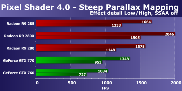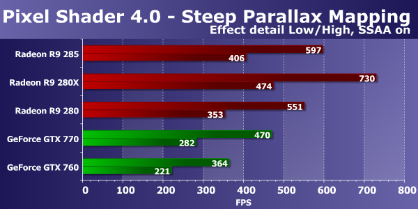 Похоже, что в этот раз мы видим результат гораздо более эффективного сжатия кадрового буфера у Tonga, по сравнению с Tahiti, да и GK104. Если сравнивать скорость заполнения сцены видеокартой Radeon R9 285 с R9 280, то разница составляет 73%, да и конкурирующая видеокарта Nvidia отстала примерно на столько же. И даже Geforce GTX 770 более чем на 40% медленнее новинки. Feature Test 3: Parallax Occlusion Mapping