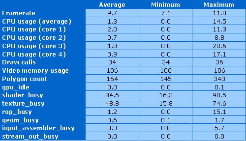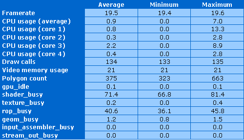 Частота кадров довольно ровная, в отличие от предыдущих графических тестов. Использование ресурсов центрального процессора сведено к минимуму, максимальные цифры загрузки встречаются только в начале, потом всё приходит в норму около 2% от возможностей тестового четырехъядерника. Количество вызовов функций отрисовки незначительно превышает 20 штук, видеопамяти используется всего лишь 11 мегабайт, а количество полигонов в сцене менее двух сотен (и те, в основном, из-за отрисовки интерфейса).