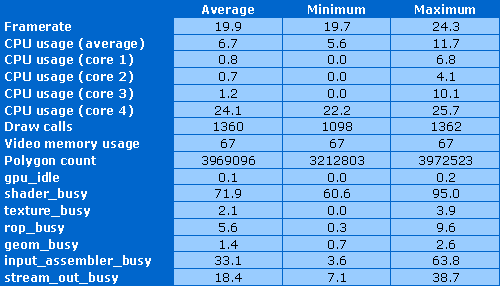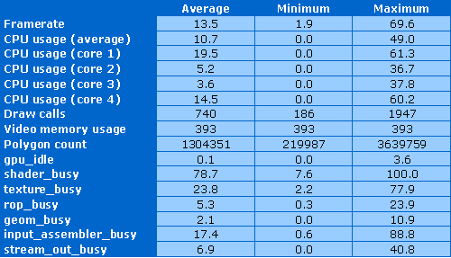 Среднее число вызовов функций отрисовки (draw calls) на кадр 740, при максимальном под 2000. Судя по этим цифрам, сцена неплохо оптимизирована. Количество полигонов, рассчитываемых за кадр (не путать с количеством геометрии в кадре) 1.3 миллионов в среднем, а максимальное 3.6 млн. Не сказать, что это рекордное число, но довольно большое даже по современным меркам. В тестовых условиях используется чуть менее 400 мегабайт видеопамяти, то есть, даже нестандартных 384-мегабайтных видеокарт должно хватать, ну а уж 512 точно. Это всё для разрешения 1280x1024, в стандартном для пресета Extreme 1920x1200 цифра будет другой.