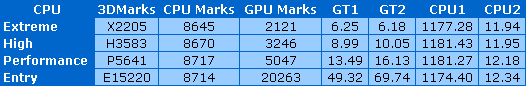 Как вы понимаете, пресет Entry предназначен для сравнения производительности интегрированных в чипсеты видеоядер и видеокарт самого низкого уровня с 128 мегабайтами видеопамяти. Performance нацелен на видеорешения среднего уровня с 256 мегабайтами видеопамяти, а наборы настроек ещё более высокого уровня требуют 512 мегабайт видеопамяти и предназначены для наиболее мощных видеокарт.