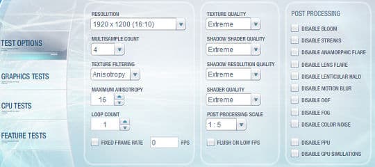 Основные настройки теста предоставляют множество возможностей по контролю над движком бенчмарка, пользователю даётся возможность отключения и изменения почти всего, что можно. Перечислим все настройки с кратким описанием: