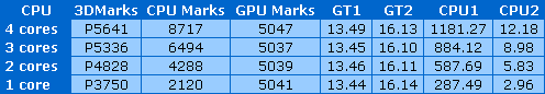 Мощность CPU, в свою очередь, также влияет исключительно на тесты центрального процессора. Для того, чтобы убедиться в этом, мы изменяли количество доступных для процесса 3DMark Vantage ядер тестового четырёхъядерного процессора и получили следующие результаты: