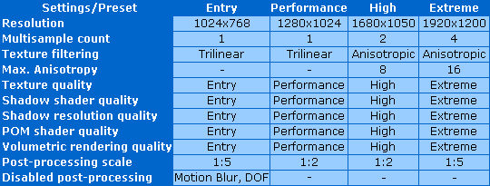 Всё устроено довольно логично. Экранные разрешения впервые выбраны с учётом распространённости LCD мониторов, особенно широкоформатных. А применение полноэкранного сглаживания и анизотропной фильтрации также сделано с учётом уровня пресета. Единственное, что непонятно соотношение разрешений эффектов постобработки и экрана, которые равны для самого низкого и самого высокого уровней.
