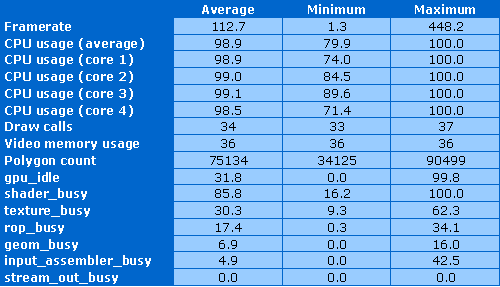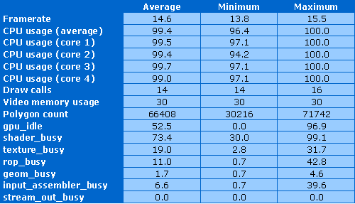 Видеочипу в этот раз ещё тяжелее, что немудрено вторая сцена сложнее. Тестовый G92 простаивал в среднем лишь треть всего времени. Загрузка шейдерных блоков в среднем составляла 85%, достигая 100%. Текстурные блоки загружены почти на треть, а блоки растеризации на 17%, остальные незначительно. Непонятно, зачем в CPU тесте задавать не самую простую работу для видеокарты. Хотели приблизить тест к реальной игровой ситуации?