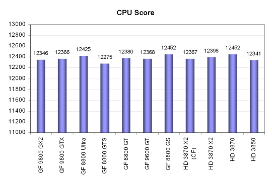 Видно, что разница если и есть, то она не зависит от мощности видеокарты, а скорее просто показывает погрешность теста, разброс его показателей. Максимальное полученное значение 12452 очков, а минимальное 12275, то есть, меньше 1.5% разницы, что является вполне допустимой цифрой погрешности.